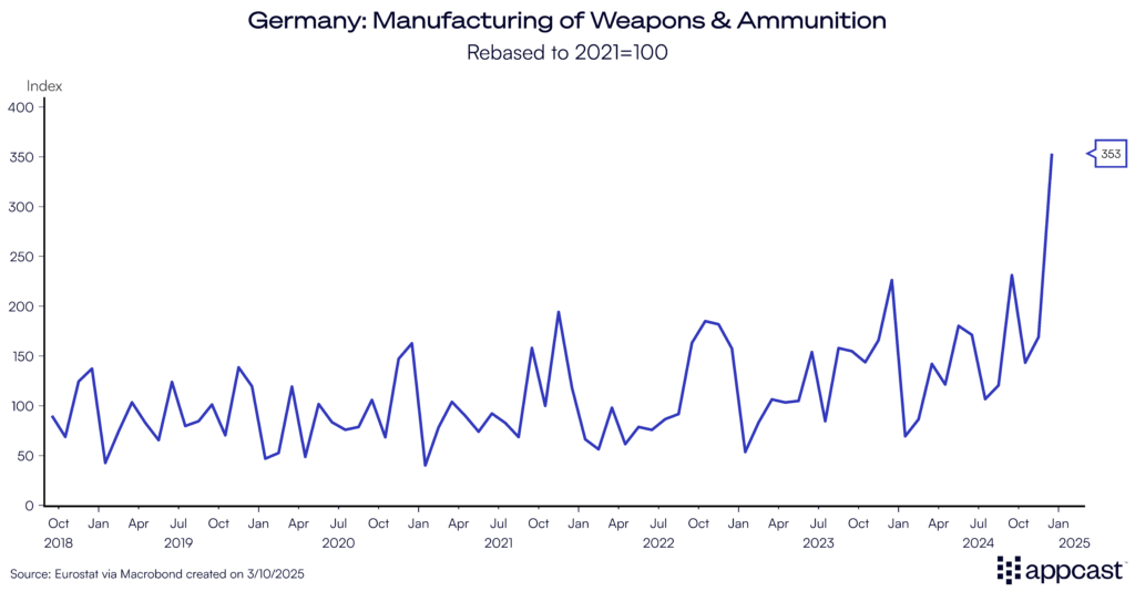 One of the biggest limitations that arms producers face, of course, is the pipeline of new orders, which can only come from governments. However, with the massive geopolitical uncertainty that Europe is now facing, being forced into a proxy war with Russia while the U.S. is threatening to dismantle NATO, the outlook for European defense spending has changed significantly within just a few weeks. German manufacturing of weapons and ammunition is surging accordingly.