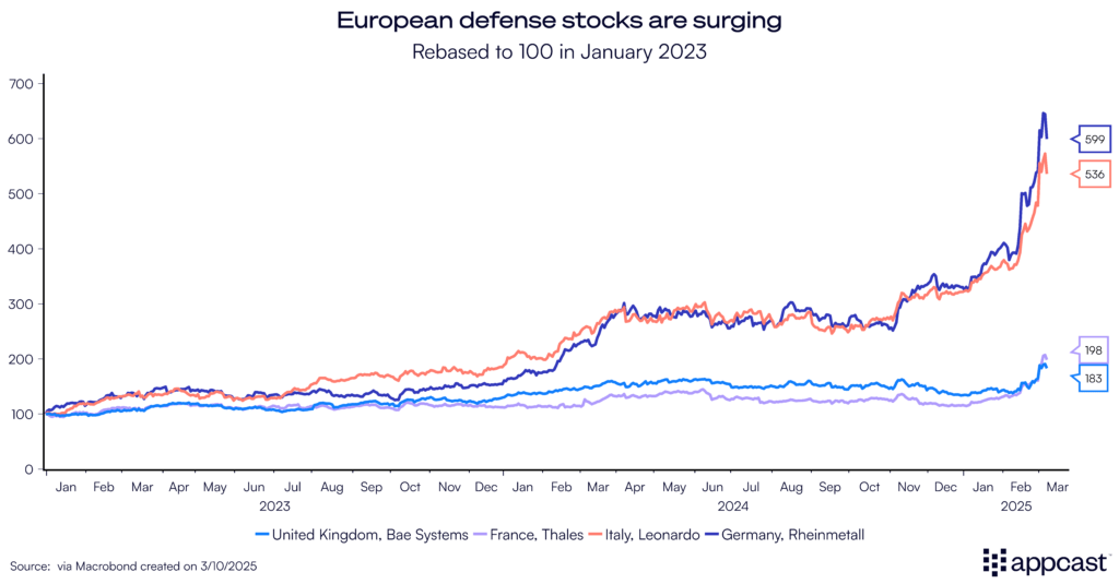 Coalition talks between the CDU/CSU and SPD suggest a consensus on ramping up defense spending. Markets have taken note, with German and European defense stocks surging.