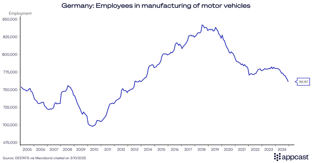 German manufacturing, and car producers specifically, are currently in crisis due to declining sales. Competition with China and the excessive cost of domestic production are heavily weighing on them. Employment in car manufacturing has already declined by some 70,000 since 2018 and additional layoffs for the coming years have been announced.