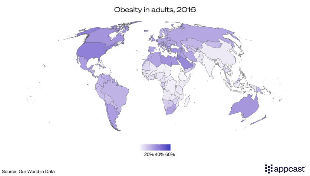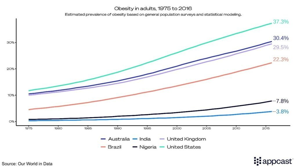 The obesity epidemic has become one of the most severe health crises of today. Using the Body Mass Index (BMI) as a metric, obesity rates have increased from about 10% in the mid-1970s across advanced economies to more than 20% in countries like France and Italy, more than 25% in Australia and the U.K., and more than 35% in the U.S.