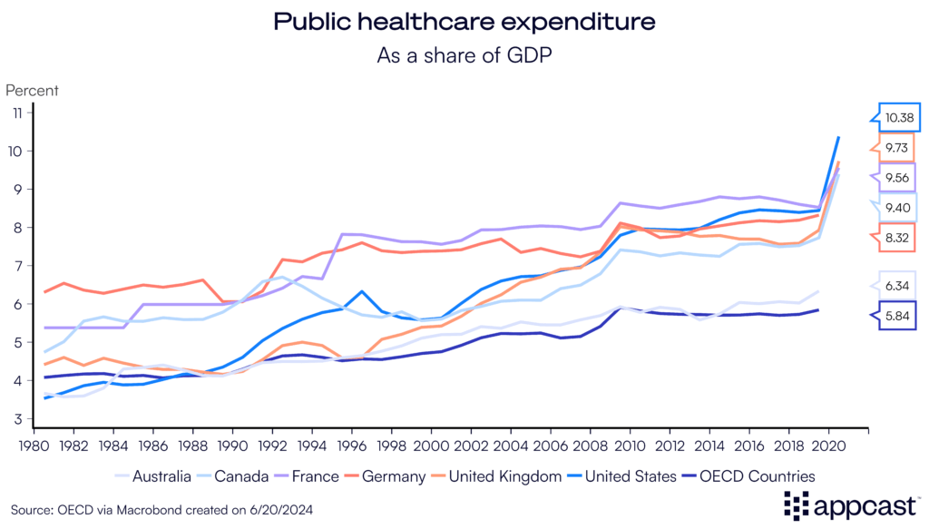 Managing obesity and its myriads of associated health complications is costly. Public healthcare spending has already increased by several percentage points of GDP across advanced economies in recent decades (the surge in 2020 is obviously related to the COVID-19 pandemic, which has exacerbated the surge in healthcare costs).