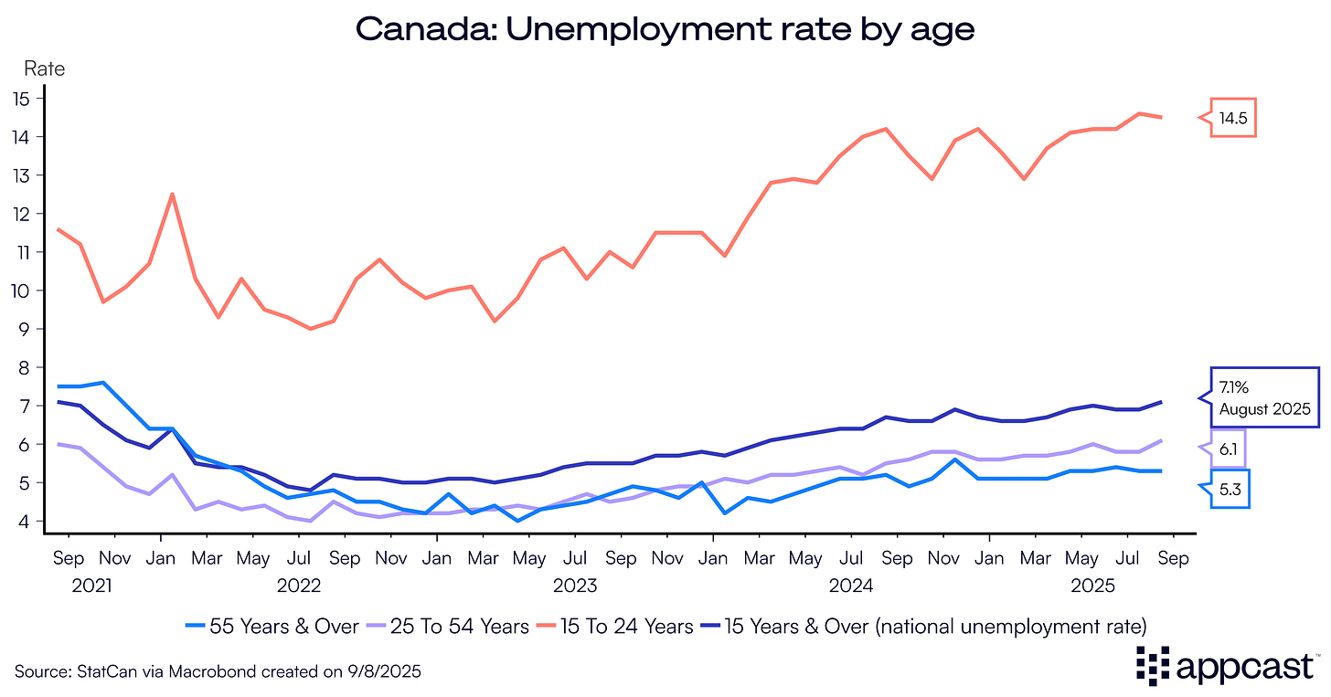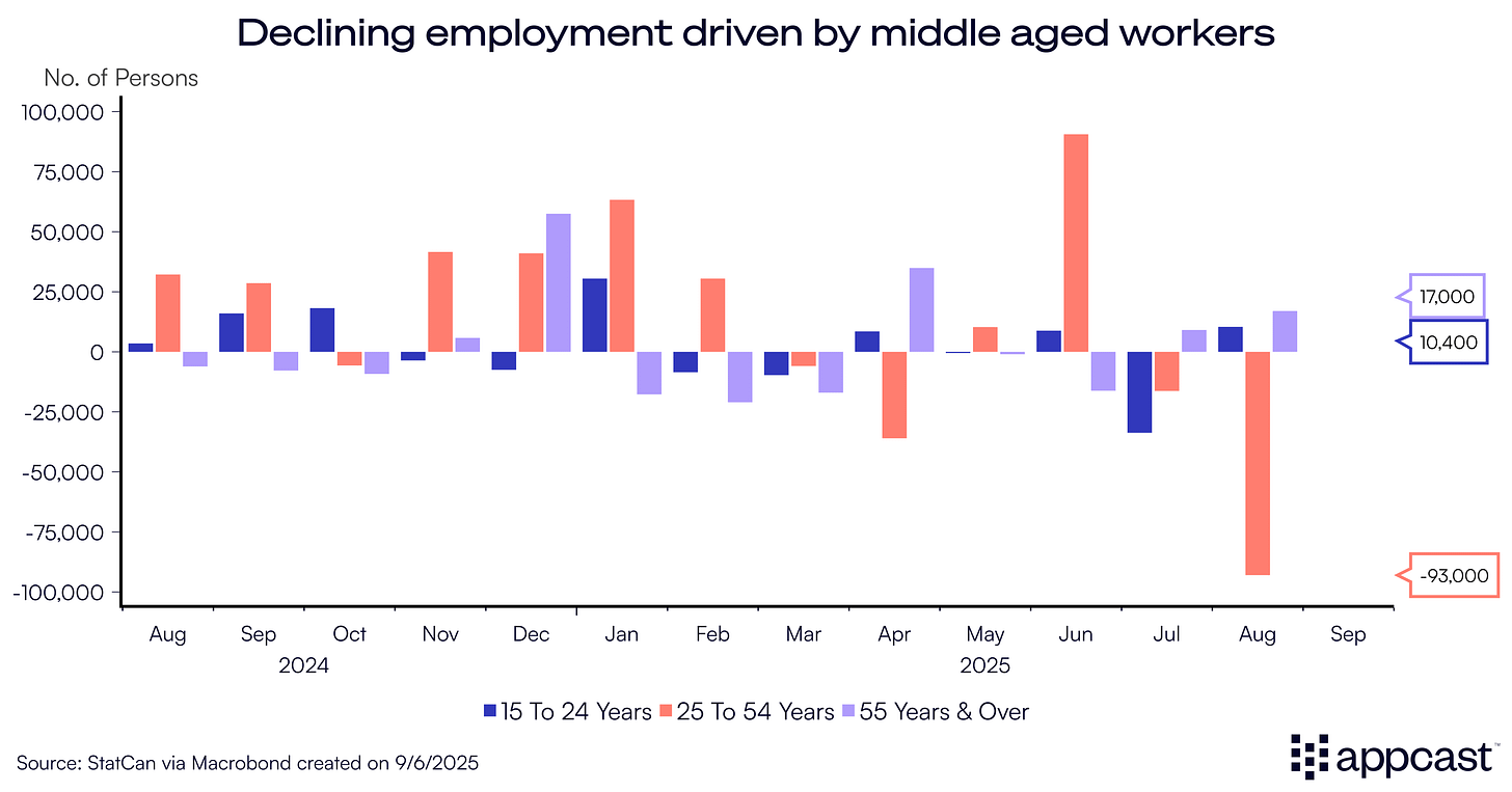 The Canadian labor market is now facing a broad slowdown affecting workers of every age group and all sectors. Employment of middle-aged workers (25 to 54 years old) contracted by 16,000 in July, followed by a further decline of 93,000 in August.