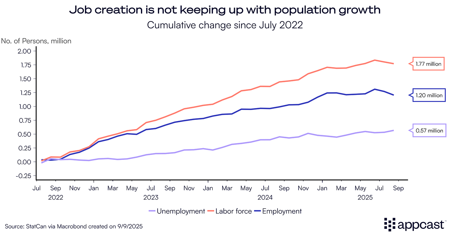Canada has historically been a high-immigration country, but following the pandemic immigration surged to unprecedented levels. Since 2022 net migration has exceeded 300,000 people per year, corresponding to an annual inflow of nearly 1% of the total population. While those inflows were manageable when the economy was booming, the current economic slowdown means that labor demand is insufficient—employers are simply not creating enough jobs to keep pace with the rapidly growing population. Since July 2022 the labor force has expanded by about 1.8 million people, while total employment has only increased by 1.2 million, leaving an additional 600,000 people unemployed.
