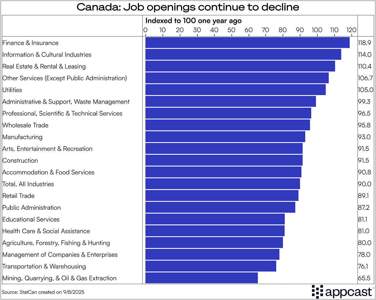 Job openings have weakened substantially since the hiring boom in 2022. Over the last year alone total vacancies have fallen by another 10%, and in most sectors job openings are now slightly below pre-pandemic levels. Like many other economies, white-collar job postings in Canada continue to be depressed as the struggling economy together with emergent AI have created weak hiring demand for roles in tech, finance, marketing, consulting, and similar occupations. Vacancies for graduate and entry level positions have plummeted as younger workers are facing the toughest labor market since the Great Recession.