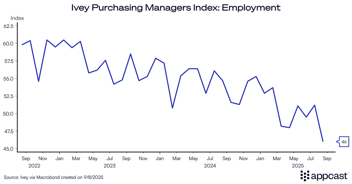 The PMI (Purchasing Managers Index) Employment Measure has fallen to its lowest level since the pandemic, indicating further layoffs ahead (values below 50 indicate that employment is contracting).