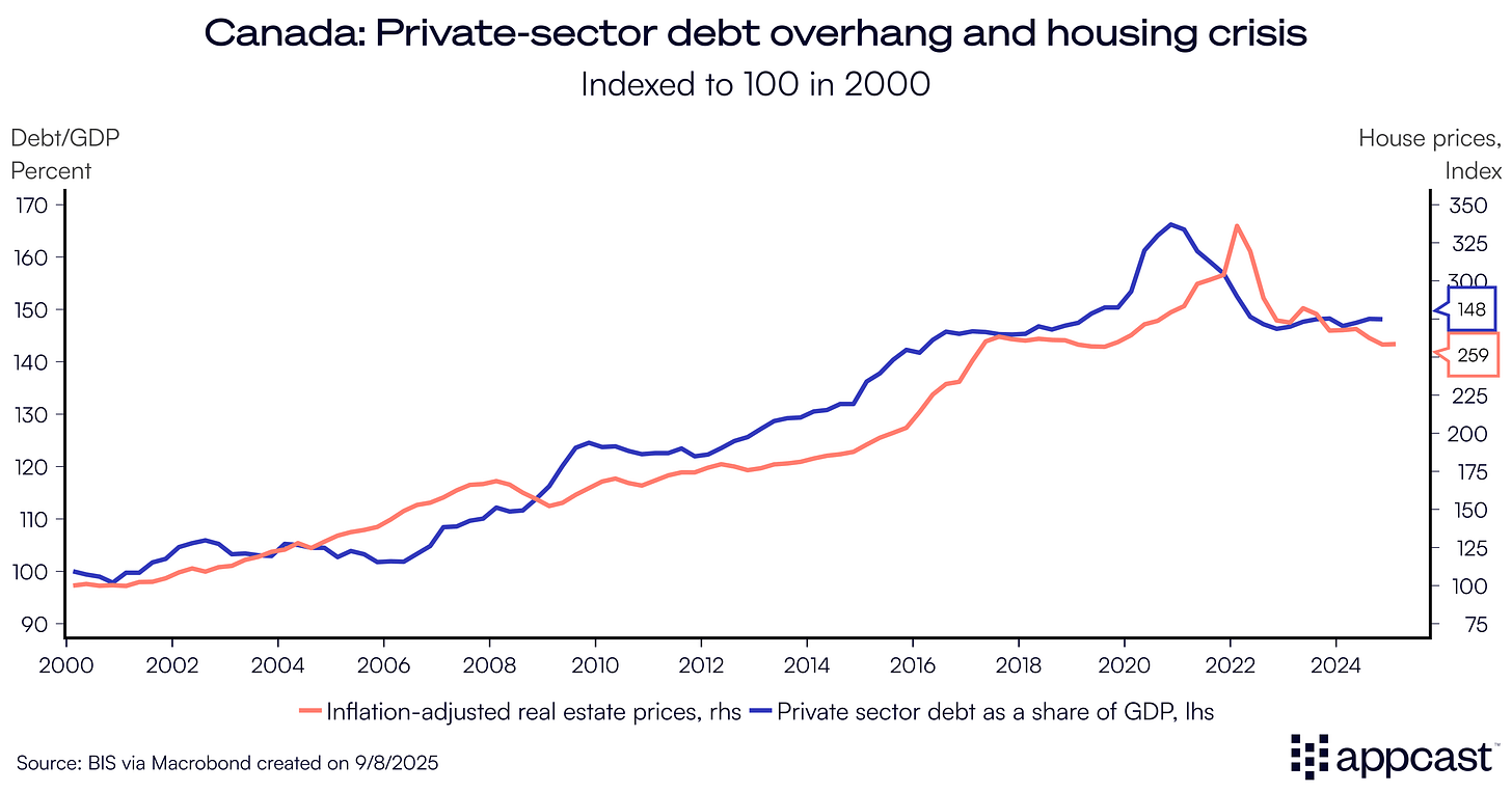 Now, the housing market has crashed down to reality. Since early 2022, Canadian house prices have fallen by almost 25%. Private sector debt has contracted by more than 10%. The weak economy has popped the bubble, which in turn is reinforcing the current economic contraction.