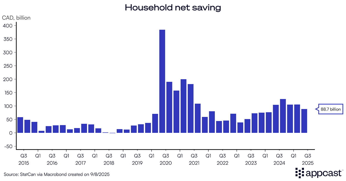 For many years, especially at the peak of the bubble, Canadian households were spectacularly poor savers. No wonder, since household wealth was surging rapidly due to the housing boom. That trend has now reversed. Household net saving surged to insanely high levels during the pandemic lockdowns and has remained elevated ever since, currently standing at an annual rate of close to 90 billion Canadian dollars (compared to less than 20 billion dollars throughout 2018 at the height of the bubble).