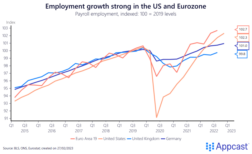 Somewhat surprisingly, employment levels bounced back very quickly after 2020 and are now higher than they were before the Covid pandemic.