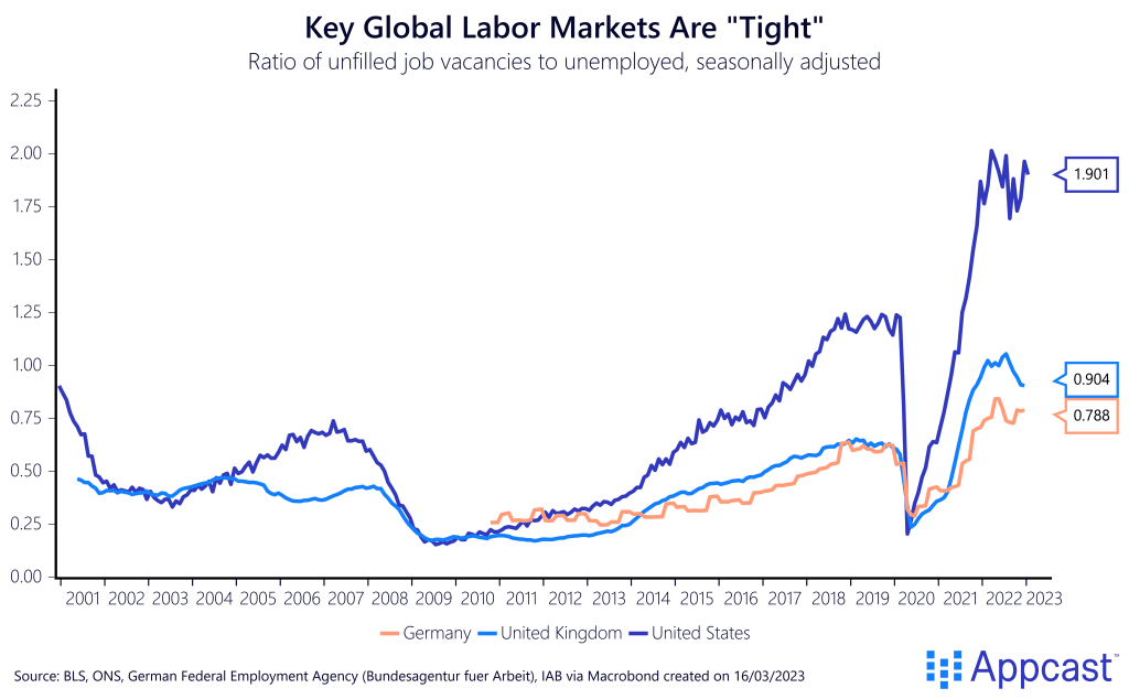The ratio of vacancies to unemployed persons has surged to unprecedented levels as there have been more vacant positions than unemployed persons, especially in the U.S. but also in the U.K. last year. The U.S. has been seeing the hottest labor market in decades and recruiters have been struggling to fill positions in the post-pandemic economy.