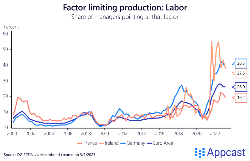 Despite the fact that employment levels have bounced back, more companies are citing labor as the limiting factor of production. In the Eurozone, Ireland and Germany seem to be particularly affected.