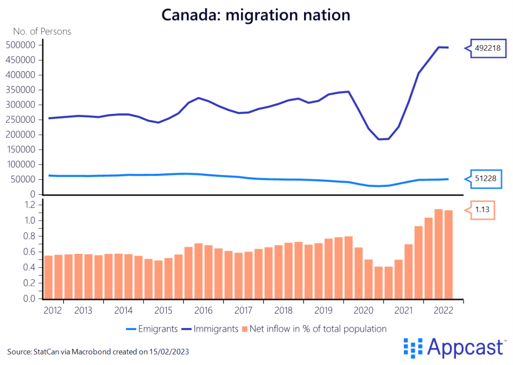 Canada is probably the role model when it comes to migration. The number of immigrants coming into the country has been historically high: the inflow exceeded 0.6% of the total population on an annual basis and this has now increased to more than 1% as of last year.