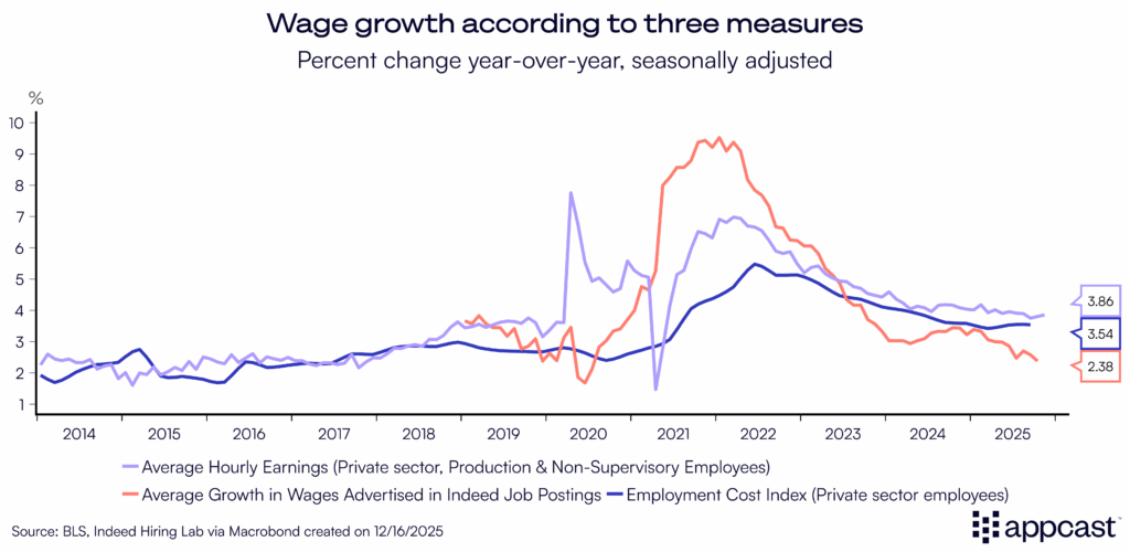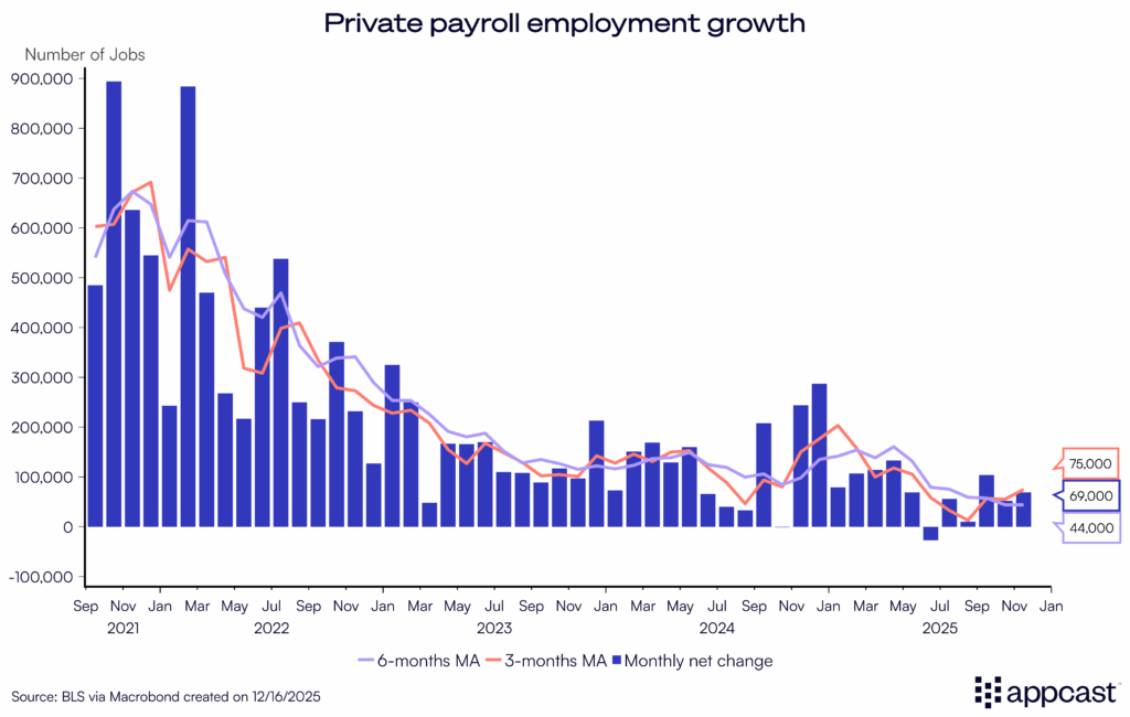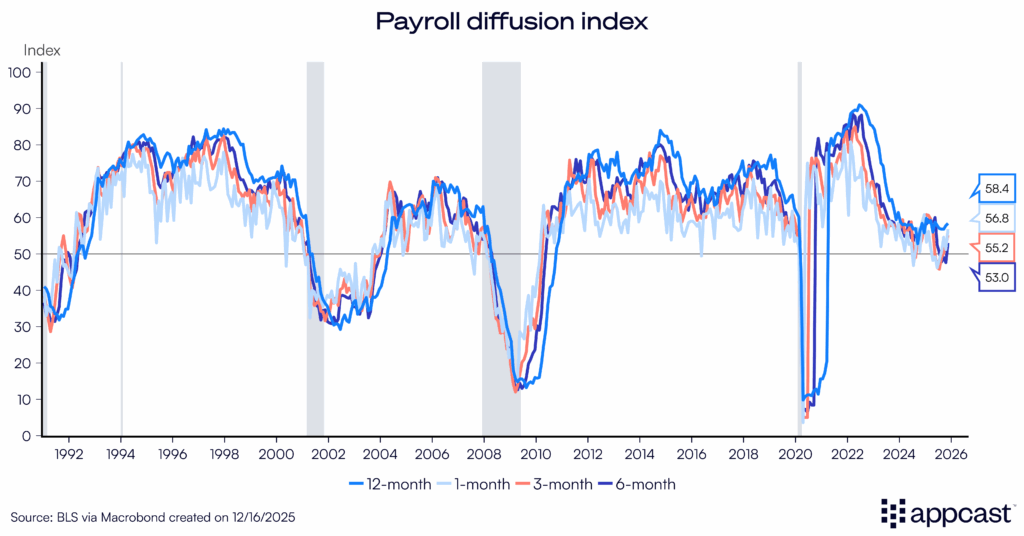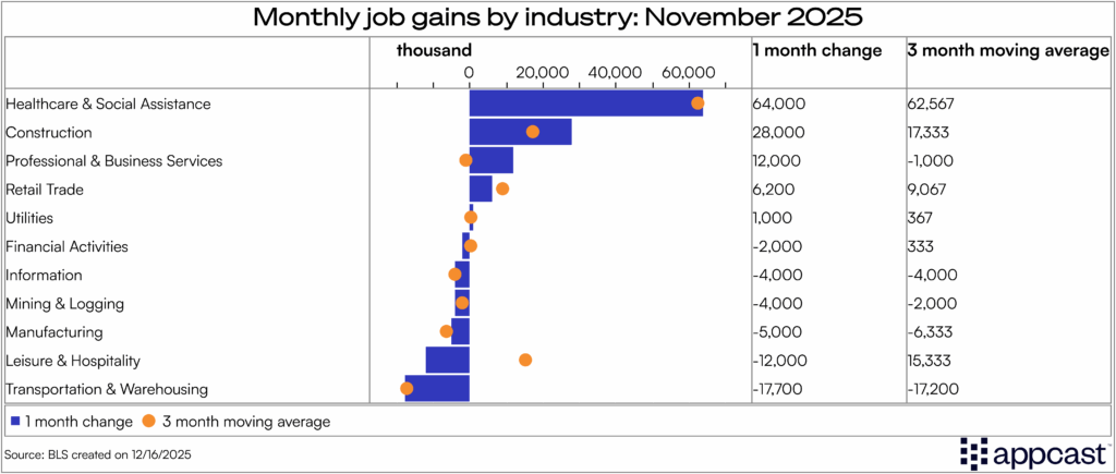 Besides healthcare, the other big gainer is construction — adding 28k jobs in November, on the heels of a similarly strong month in September. Perhaps the data center boom is behind this? Recruitonomics will dig in to confirm in the coming weeks. An initial look under the hood shows that a majority of construction job growth is concentrated in non-residential specialty contractors, so the A.I. hypothesis is plausible. At this moment, it seems healthcare and A.I. may be all we’ve got — and that may be enough to continue carrying the labor market.