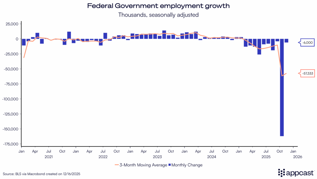 Remember the Department of Government Efficiency (DOGE) and its “fork in the road” email earlier this year? Well, the hundreds of thousands of federal employees who accepted the offer of deferred resignation finally appeared in the jobs data as federal payrolls shrunk by 162k in October alone, and then by 6k more in November.