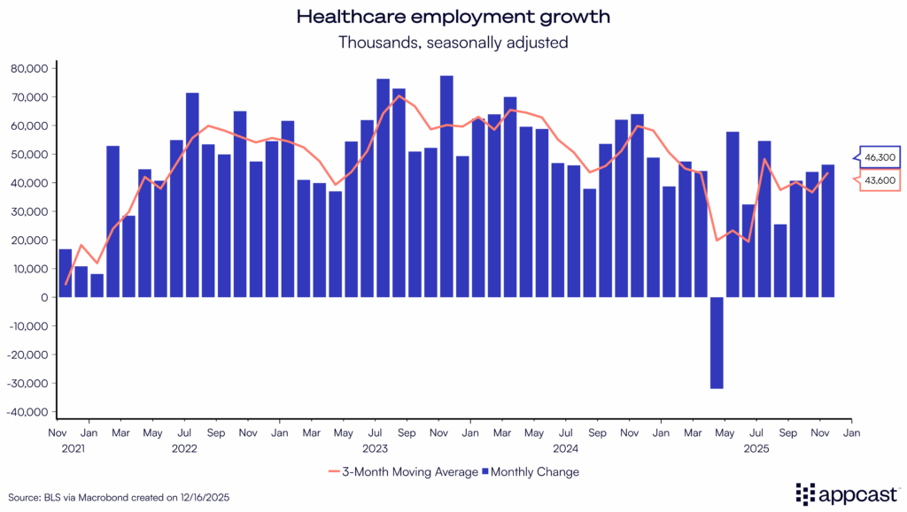 That said, some consternation is warranted. Much of the labor market’s strength is in healthcare. More than much — all of it, actually. On average, healthcare is adding 42k jobs per month in the three months through November, far above private-sector pace.