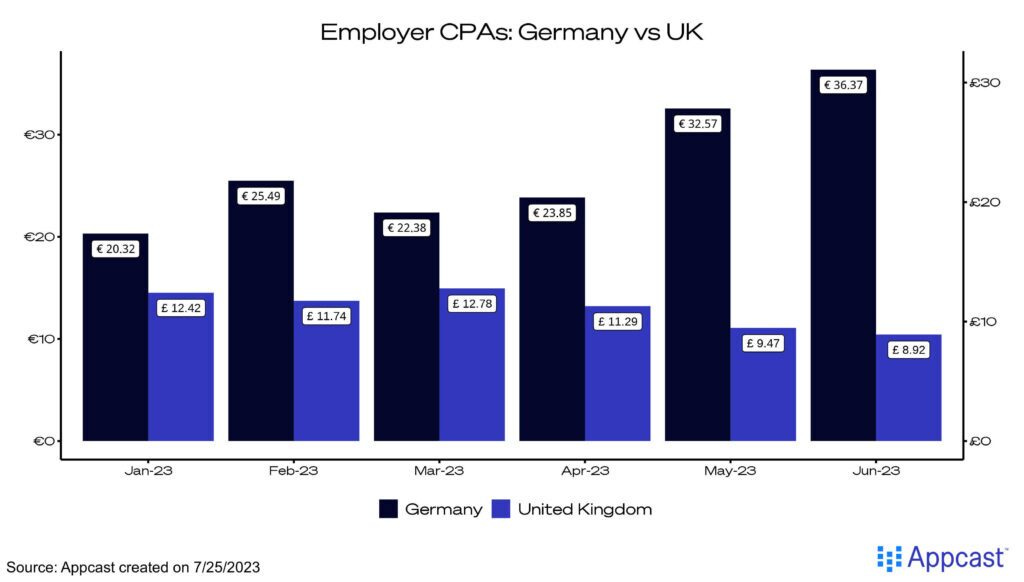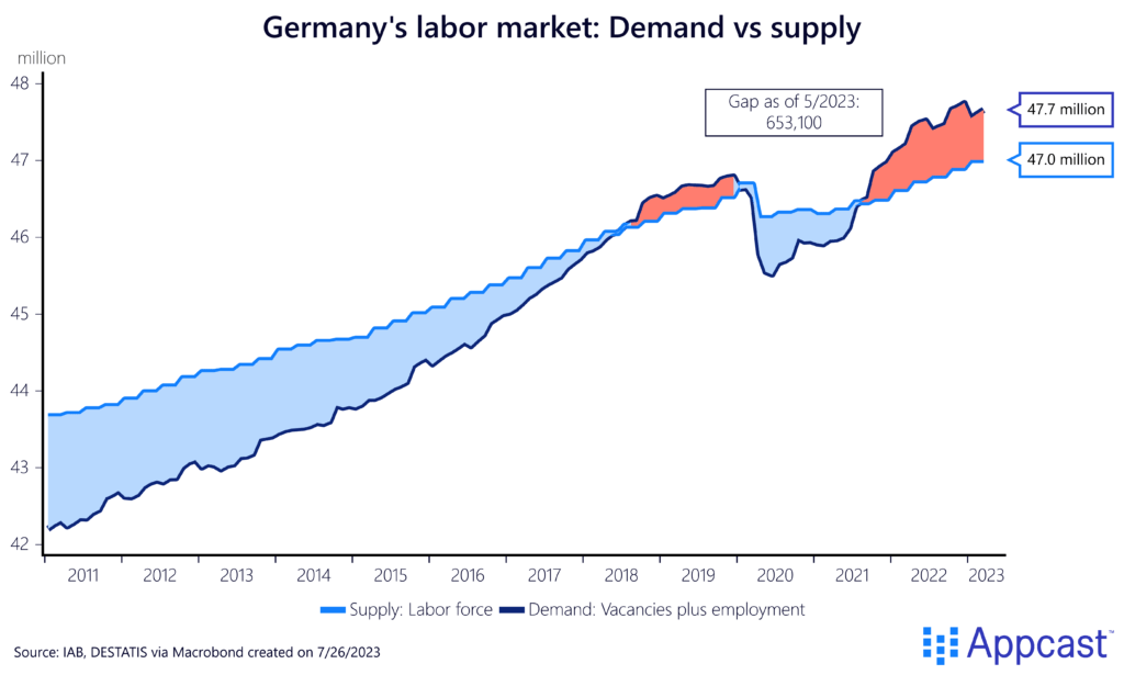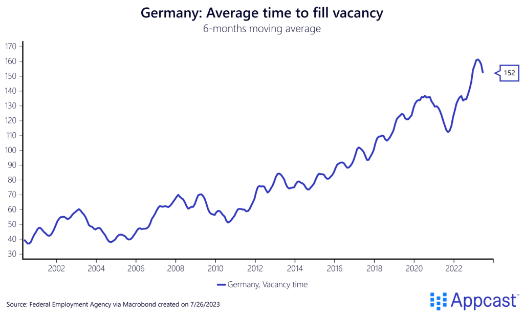 Appcast’s own data suggests that the cost-per-application (CPA) in Germany is substantially higher than in the U.K., for example. CPAs reflect demand and supply conditions in the labor market. A high CPA is indicative of a shortage of workers for open positions. Recruiters in Germany are willing to pay substantially more for each application they receive.
