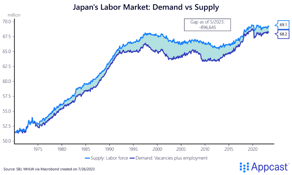 The long-run demographic outlook for many European countries is extremely similar – following Japan with a small lag – since fertility rates have declined for decades and have fallen well-below the replacement level of 2.1. It should thus be no surprise that labor shortages will increase in severity in the coming years. Our own research shows that Germany alone is missing some 650,000 workers right now, if not more. And this gap is only going to increase as the country’s population is aging rapidly.