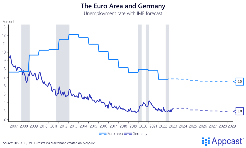 Even as Germany has now fallen into a technical recession – and the Eurozone only narrowly avoided one – unemployment rates have continued to decline. And IMF forecasts suggest that they will remain lower for the foreseeable future than they have been in the past. Companies scarred by the recruitment difficulties in 2021 and 2022 will predominantly engage in labor-hoarding first before letting people go. So do not expect the current labor market tightness in the Eurozone to ease up any time soon!