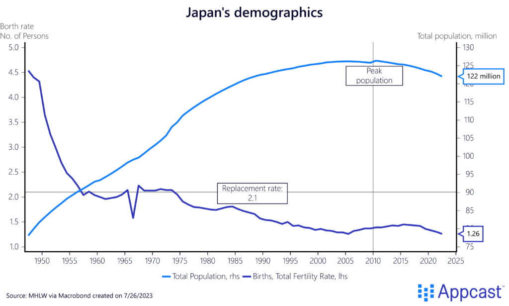 Japan’s fertility rate fell below 2.1 in the mid-1970s and has steadily declined afterwards to a low of about 1.3 in recent years. As a result, Japan’s population peaked in the late 2000s and has shrank ever since.