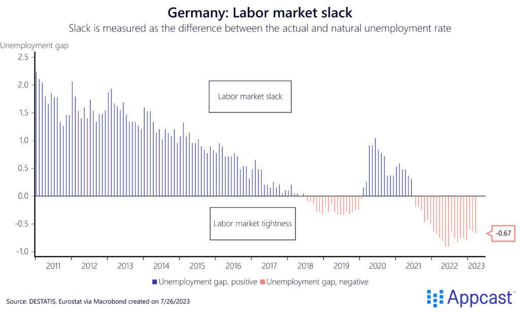 We use the same methodology to get an estimate for the natural rate of unemployment for Germany. What our chart shows is that labor market slack gradually softened over time during the 2010s. By 2018, Germany’s labor market was already tight as the actual unemployment rate fell below the estimated natural rate for the very first time. And this labor market tightness has only increased with the pandemic and will remain for the foreseeable future, given that Germany’s working-age population has already started to decline.