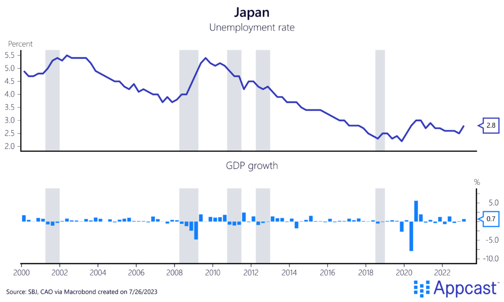 Both adverse demographics and mediocre productivity growth can explain why rapidly aging economies like Japan will see more and more technical recessions in the future even as the labor market remains strong. One can see how Japan’s unemployment rate continued to decrease even as economic growth sputtered, simply because the country’s labor force has shrank and workers have become scarcer. Japan is in the midst of a full-employment recession.
