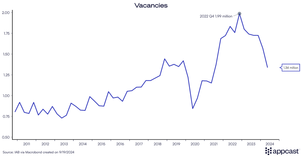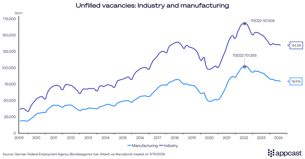 For recruiters, this means that the severe hiring challenges that companies have faced in Germany due to labor shortages have eased for now because of the substantial weakening of the labor market. If your business is still recruiting in Germany, you will be able to attract more clicks and applies to your job postings, and at a lower cost, since there is less competition.