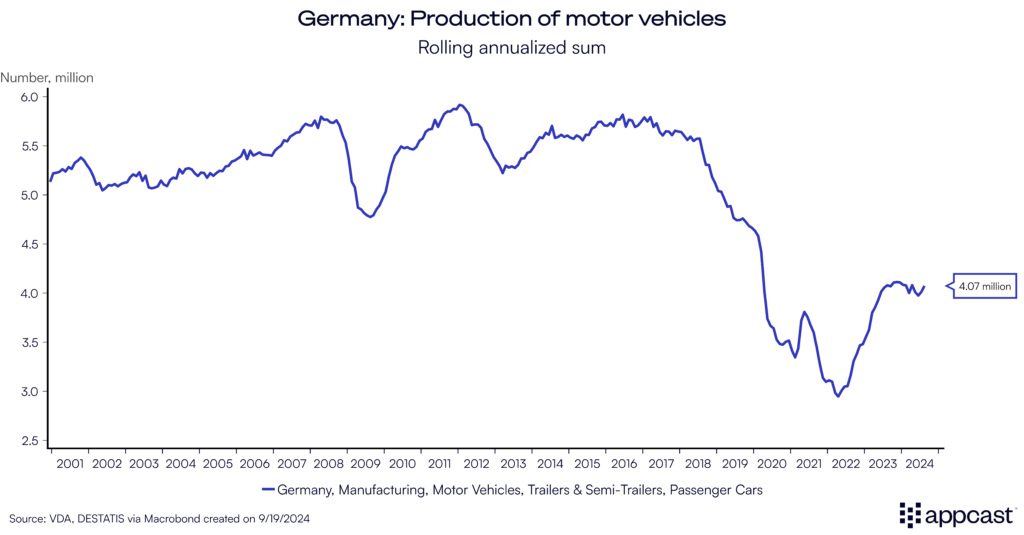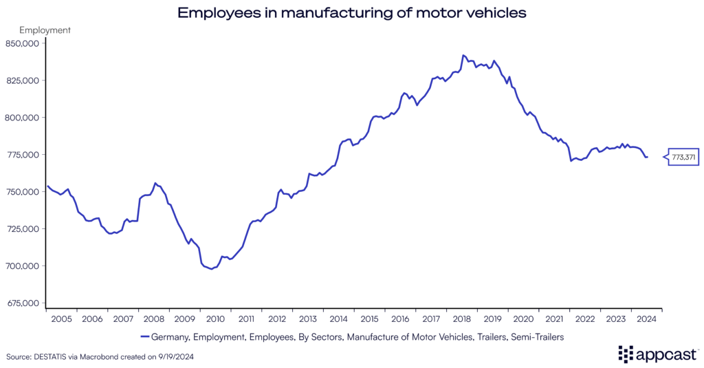 And it is not just the car producers that have been struggling. Manufacturing has shed some 100,000 jobs over the last year. Dozens of large employers have recently announced that they will need to lay off workers. The prominent companies that are shedding jobs in Germany span across many different manufacturing industries, showing how the country’s economic weakness is broad-based.