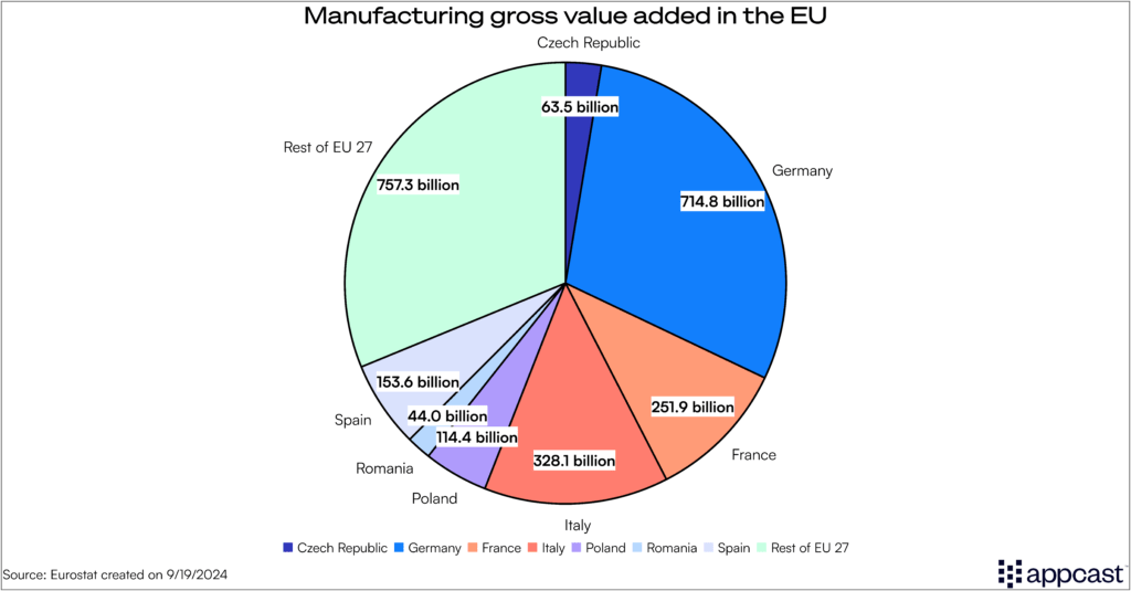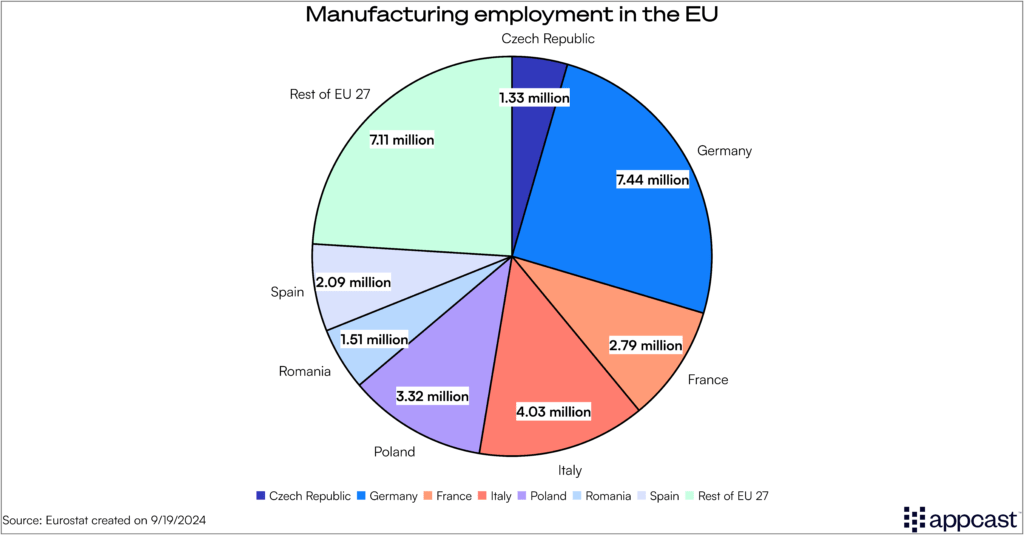 Germany has been a global manufacturing powerhouse for decades. While its population of 85 million is just under 20% of the European Union’s total, Germany hosts about 25% of all European manufacturing jobs – more than 7.4 million.