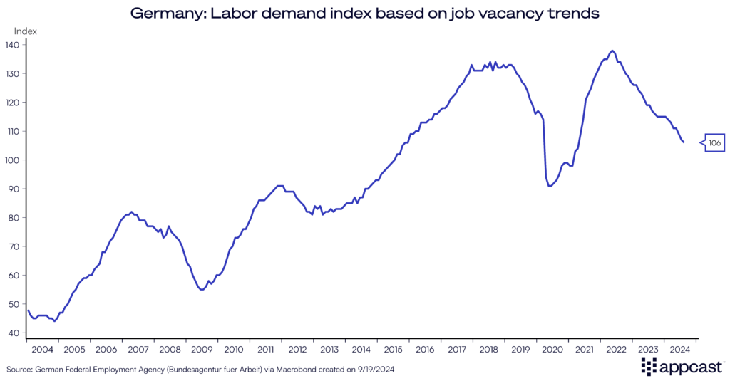 Even as Germany’s unemployment rate remains reasonably low due to a rapidly aging workforce, the demand for workers is clearly slowing. While some sectoral shortages remain in the blue-collar space, vacancies for high-skilled workers are declining rapidly.