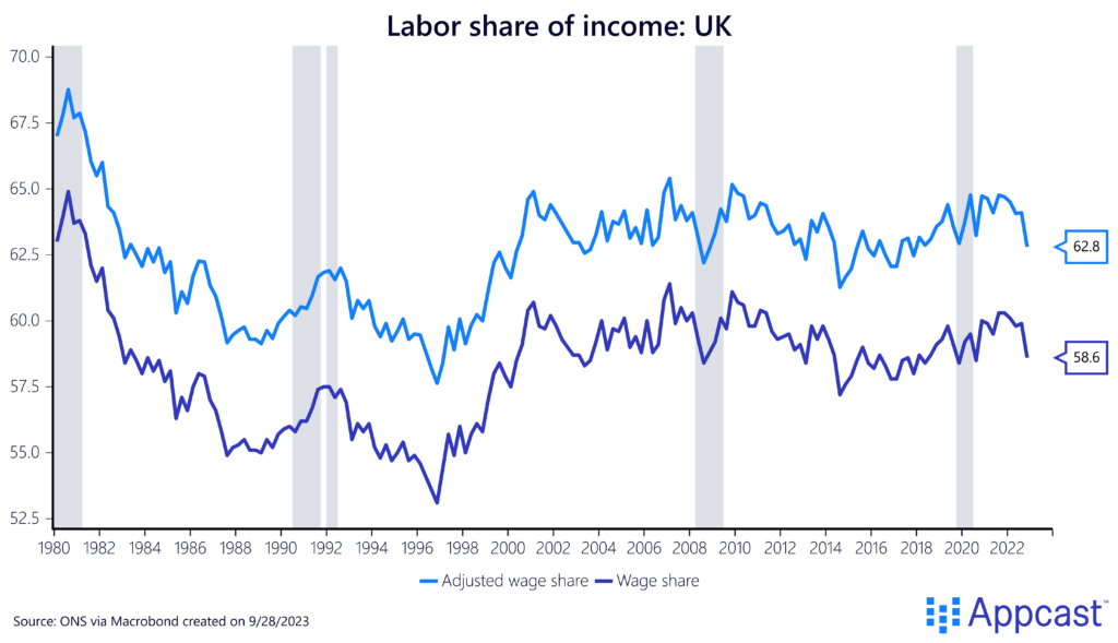 For the U.K. and Eurozone, the terms of trade shock – higher import prices – were also a big factor. This was mostly the result of the surge in energy prices. The U.S., being a big energy producer, was less affected.