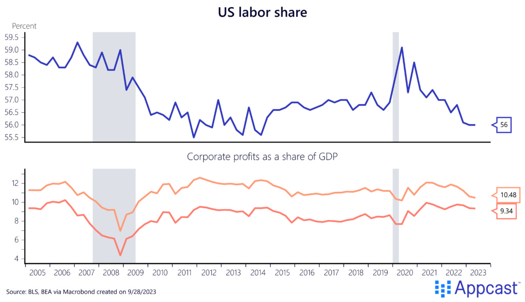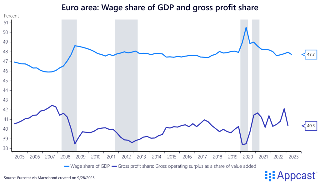 The labor share for the Eurozone surged early on during the pandemic before falling back down. Gross profits – measured as a share of value added – for the Eurozone show the largest temporary increase in 2021 and 2022. The latest data point though shows a decline back to pre-pandemic levels.