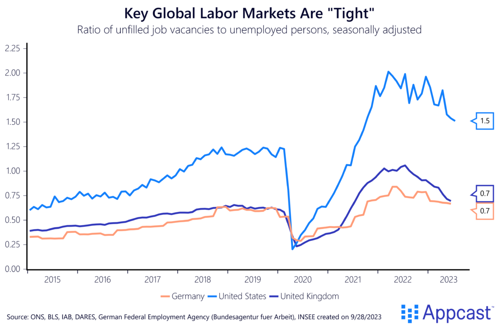 There is no doubt that the labor market tightness that advanced economies have seen since the pandemic has been one big factor pushing up inflation. The number of unfilled vacancies to unemployed workers surged to record highs. Poaching became more common as the pool of idle workers on the sideline shrank and job switchers also larger wage gains.