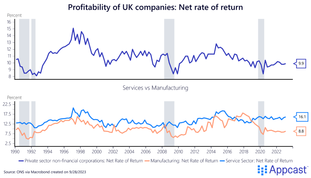 While profitability of the service sector ticked up slightly, profitability for manufacturing actually declined, thus leaving the aggregate measure unchanged.