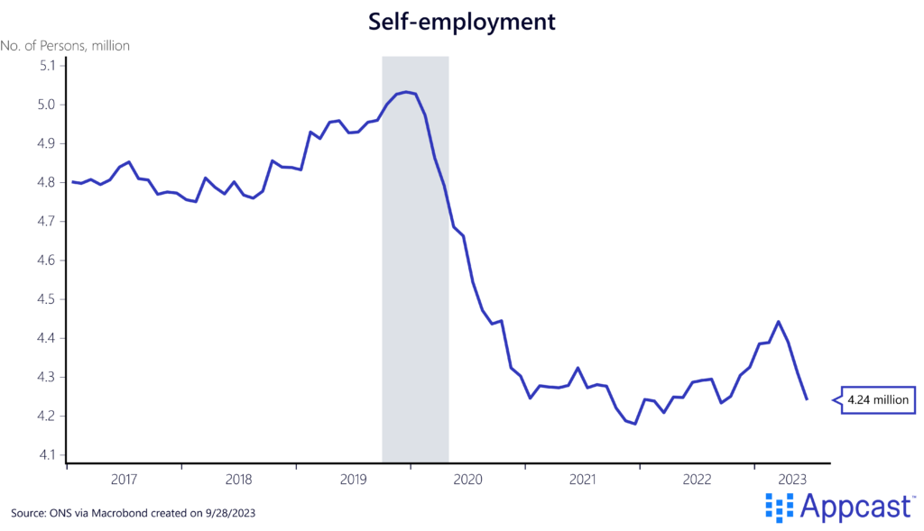 Even as the number of self-employed in the U.K. has plummeted, mixed income from self-employment has not. Our best guess is that many of the self-employed that dropped out of the labor force during the pandemic simply generated extremely little income from their activity.