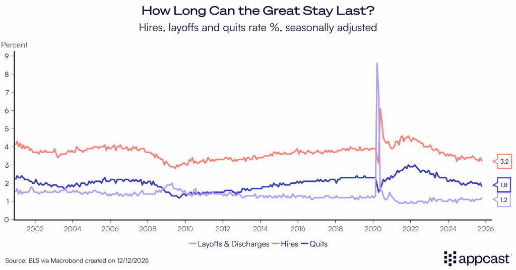 As we head into the new year, the key question for recruiters is whether the “Great Stay” continues as a low-hiring, low-firing environment, or whether the risk of a broader downturn is beginning to increase.