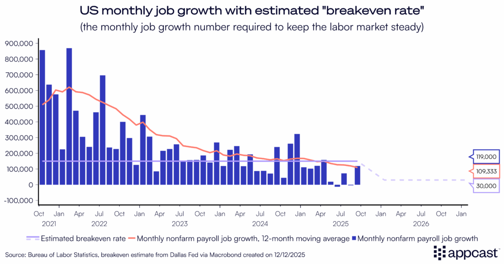 October’s and November’s jobs data could tell us much about the future path of the labor market. If private estimates are correct, it is increasingly likely that payroll growth turned negative in at least one of those months. That outcome may reflect a short-term disruption tied to the government shutdown, or it could signal a more persistent slowdown in hiring.