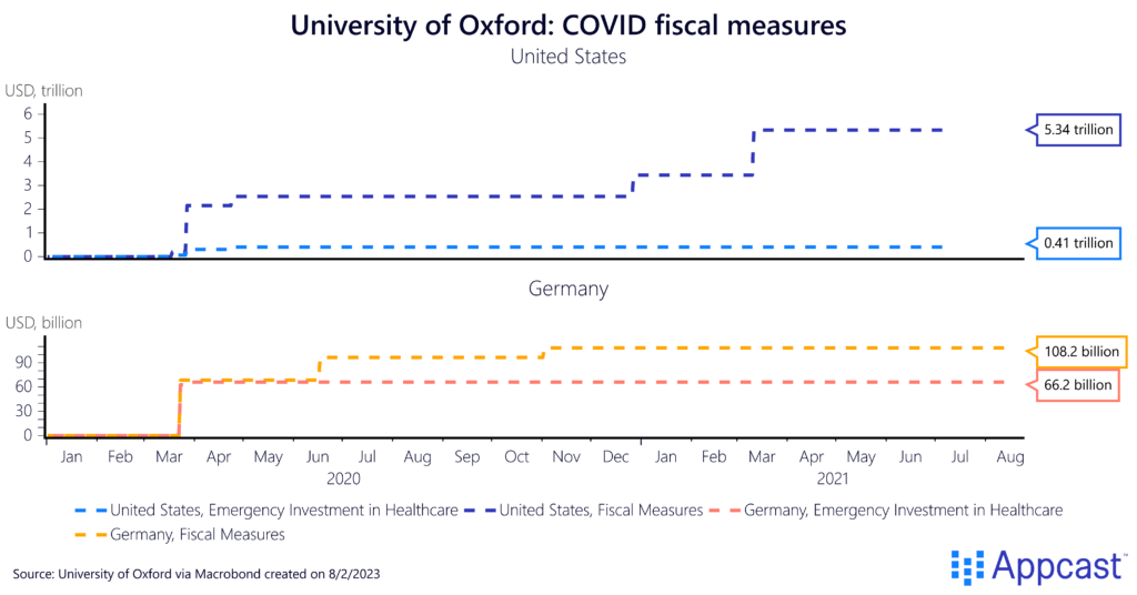 For Germany, the Oxford tracker shows a total stimulus package of about 110 USD billion in stimulus together with some 66 USD billion in healthcare emergency investment. While the German government also supported the economy with a temporary VAT tax cut and credit support for businesses, the IMF puts the total German fiscal stimulus at a little over 10% of GDP, so roughly half of what the U.S. provided.