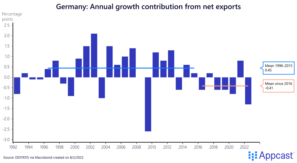 But as the chart shows, exports have negatively contributed to GDP growth by about minus 0.4 percentage points since 2016, which is a substantial negative drag on domestic growth each year due to international headwinds. This reversal can explain why part of the growth slowdown the German economy has been experiencing in recent years.