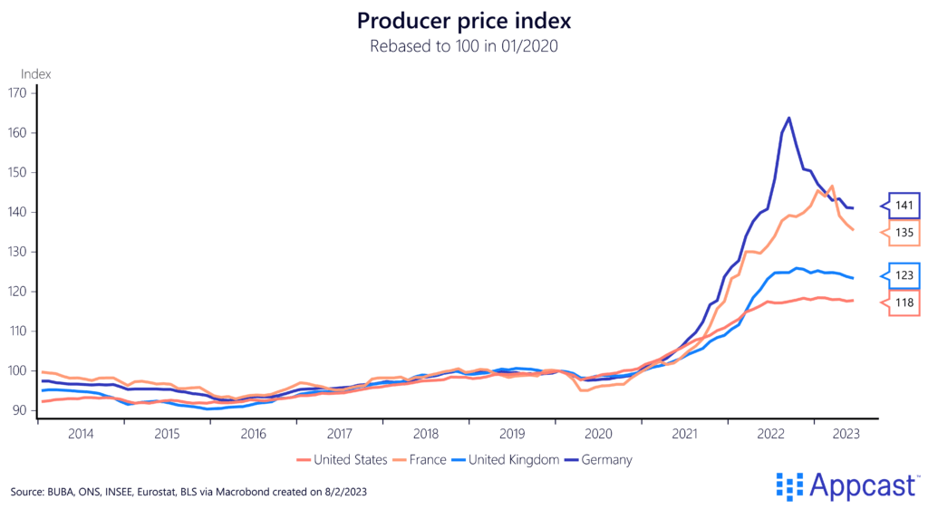 In Germany, producer prices increased by more than 60 percent within one-and-a-half years and are elevated by more than 40 percent compared to pre-COVID levels. In comparison, producer prices increased by less than 20 percent in the U.S. and by only about 25 percent in the U.K.