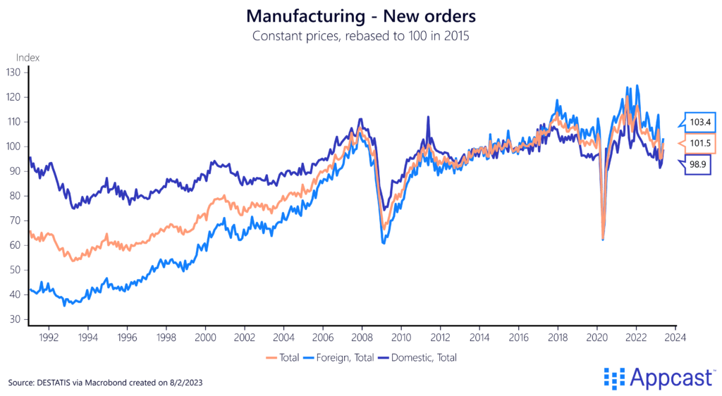 Manufacturing orders in real terms have been stagnant since about 2016. This is not just true for domestic orders but also for demand from abroad, which had performed extremely well until the mid-2010s.