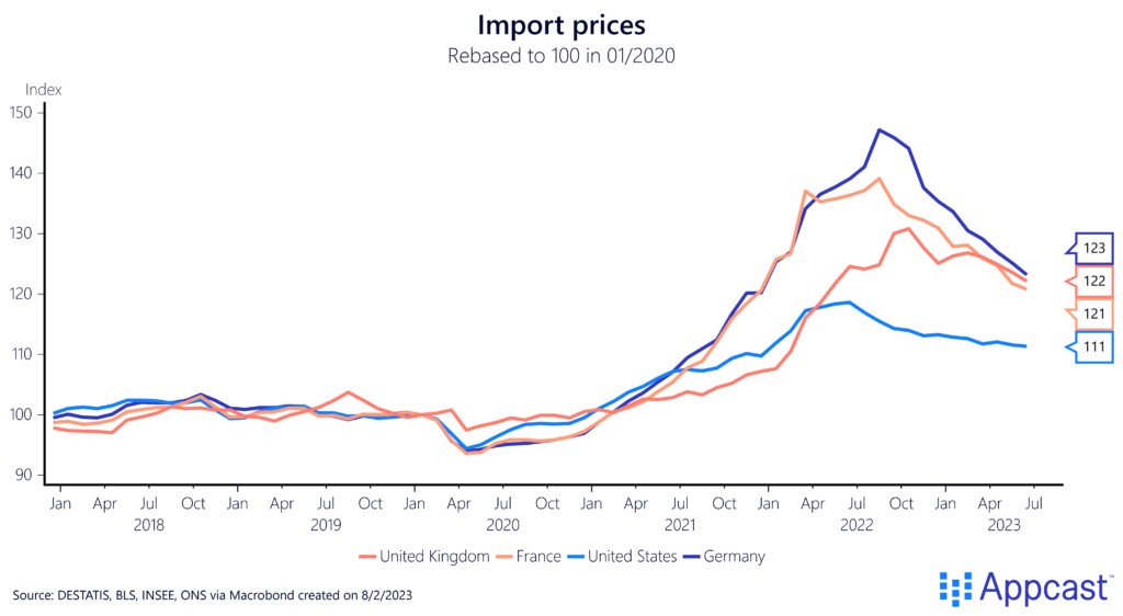 The massive increase in import prices also led to surging producer prices across advanced economies. Producer prices reflect the cost of produced goods and services sold at home by domestic producers.