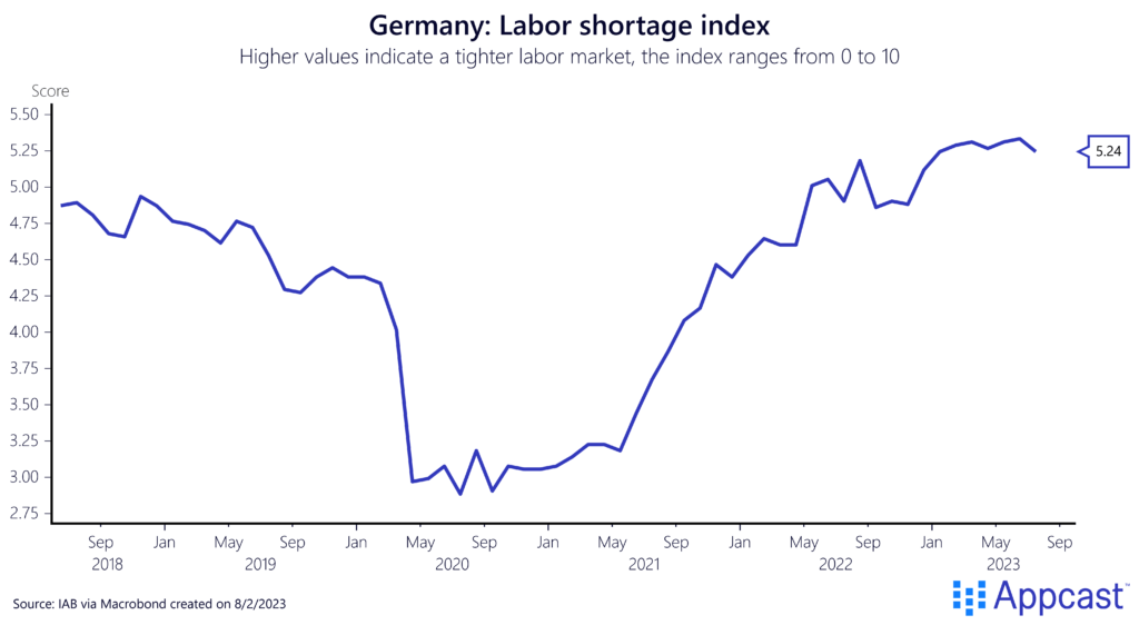 Another factor hurting German growth is a massive skilled worker shortage that the country is currently experiencing as its population is aging rapidly and the workforce has started to shrink. Even as record-high migration is providing some relief, the mismatch in the labor market remains and the skilled worker shortage is not getting solved. Many of the recent immigrants are low-skilled workers and face language barriers and other obstacles that make integration into the German labor market difficult. The labor shortage index from the IAB (institute for employment research) stands at a record high, even as the German economy fell into a technical recession in early 2023.