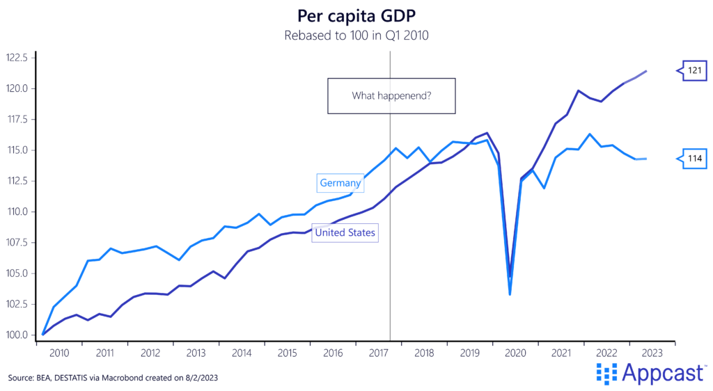 We ended the last blog post with the following chart that shows how Germany has recently underperformed. The country was in a technical recession earlier this year and GDP per capita in 2023 is no higher than in 2017. The reasons why Germany’s economy has struggled to such an extent are multifaceted. In this blog post, we will outline the main culprits and explain in detail how they have contributed to Germany’s underperformance in recent years: