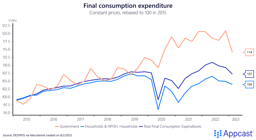 German consumers have faced various headwinds: First the COVID economic shock, then soaring food and energy prices as a result of the war in Ukraine, and now soaring interest rates and declining economic activity. It is a bad idea to pull back government spending while the rest of the economy isn’t holding up.