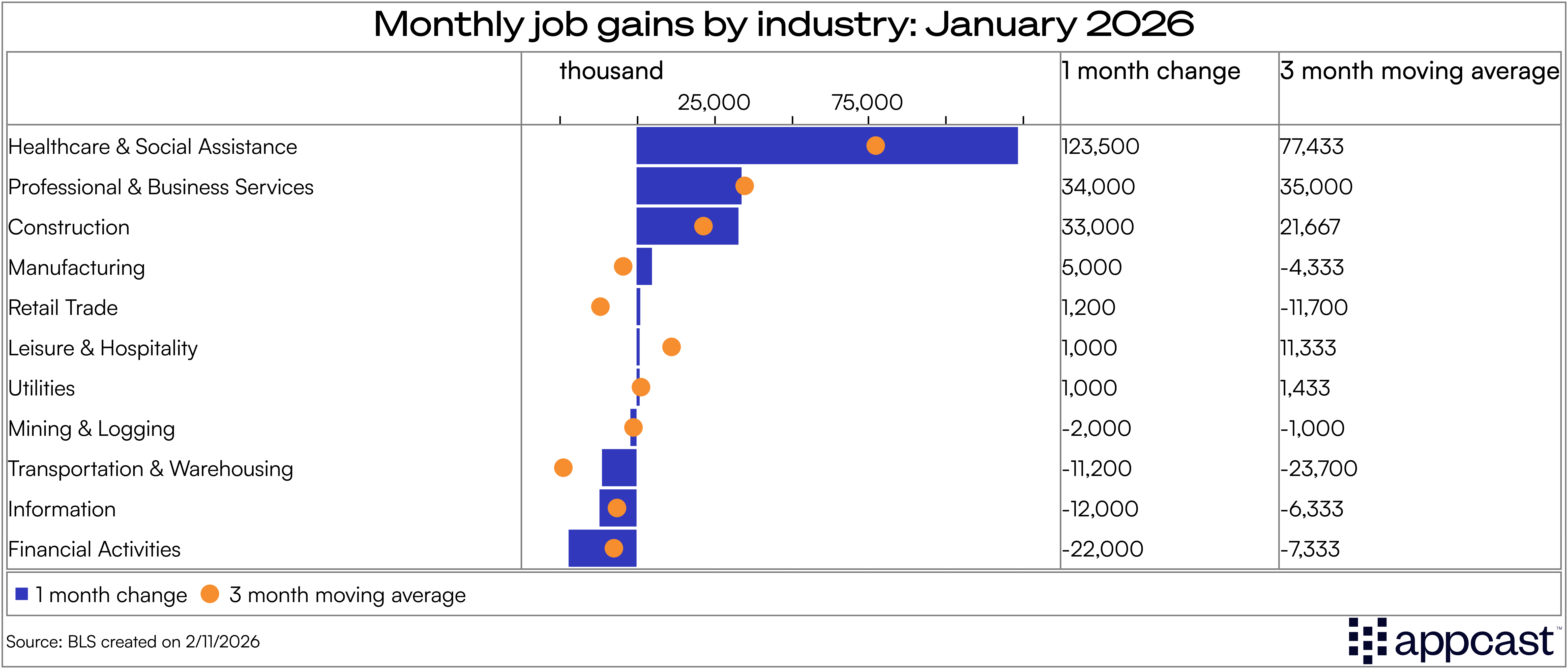 Healthcare & Social Assistance continue to dominate the labor market, adding 123,000 new jobs — the strongest month for job growth since the immediate recovery from the pandemic in 2020. Within the sector, Ambulatory Healthcare Services, which is mostly comprised of outpatient care services, added 50,000 new jobs.