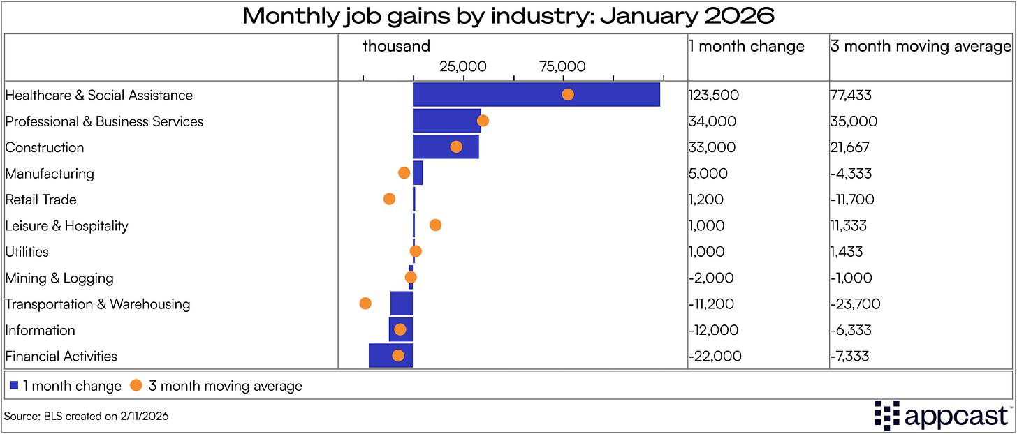 Construction had a solid month as well, contributing 33,000 jobs to overall growth. Within the sector, nonresidential specialty trade contractors added 25,000 jobs, likely due to the AI data center boom. Manufacturing, a sector that has been stagnating under trade policy pressures throughout 2025, also had its first positive month of growth since November of 2024.