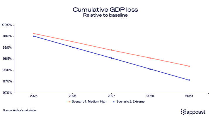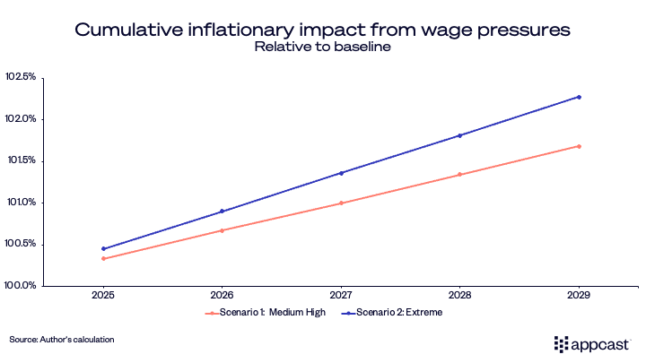 In the most adverse outcome, wages for this population increase cumulatively by an additional 4% between 2025 and 2030. We will see below that this is a quite conservative projection. Under different assumptions, wages are likely to increase at an even higher rate.