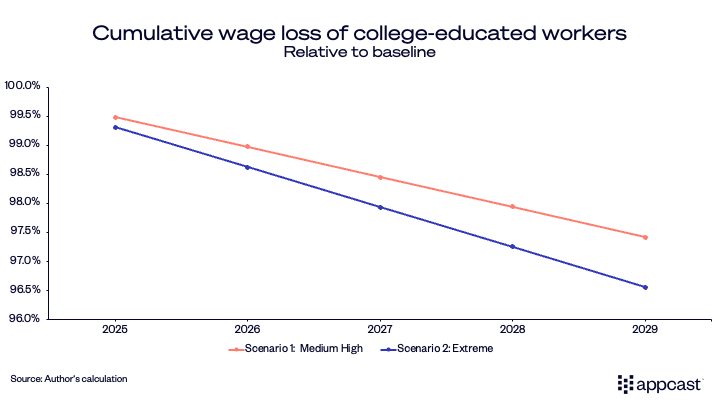 By the end of the period, wages of college-educated workers are between 2.6% and 3.4% lower relative to baseline as the economy becomes less productive (college-educated and non-college-educated workers are complements in this scenario).