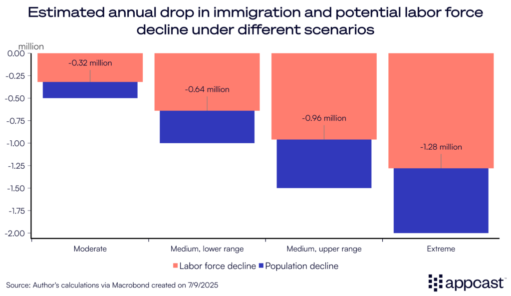 The labor force participation rate for those workers is typically high, close to 80%. Those two numbers help us translate the decline in immigration into a decline in the potential labor force. Between the moderate and extreme scenario, we are talking about annual drop in the potential labor force ranging from a little over 300,000 to just under 1.3 million. However, the range between the two medium scenarios seems the most likely outcome to us for now, given the capacity constraints that mass deportations are facing.