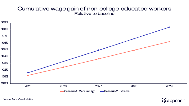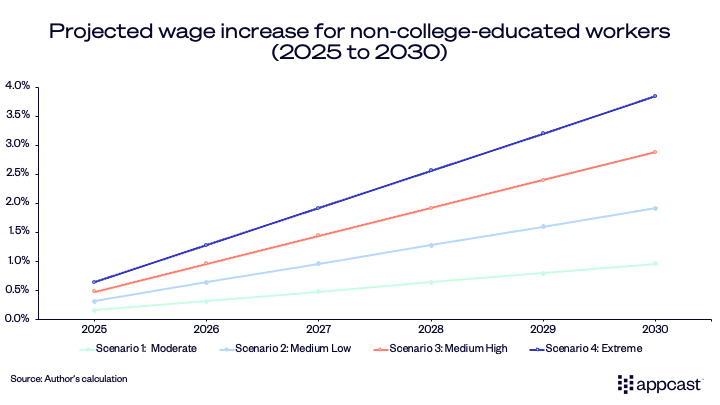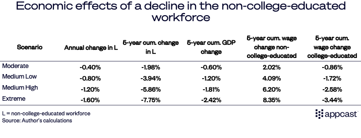 Assumptions: Wage elasticity of -0.4, total pool of 80 million non-college-educated workers, approximately half of U.S. employment. Annual declines equal approximately 0.4%, 0.8%, 1.2%, and 1.6% of the non-college educated workforce.