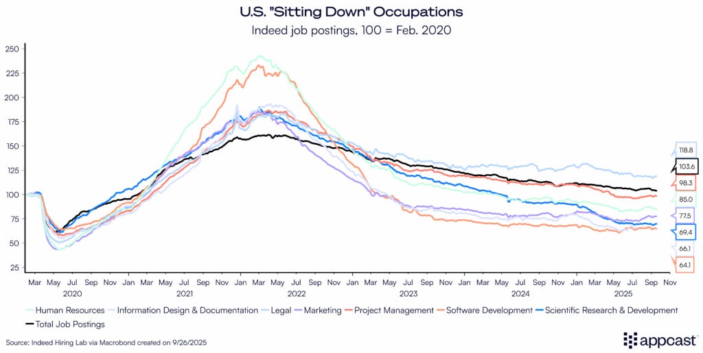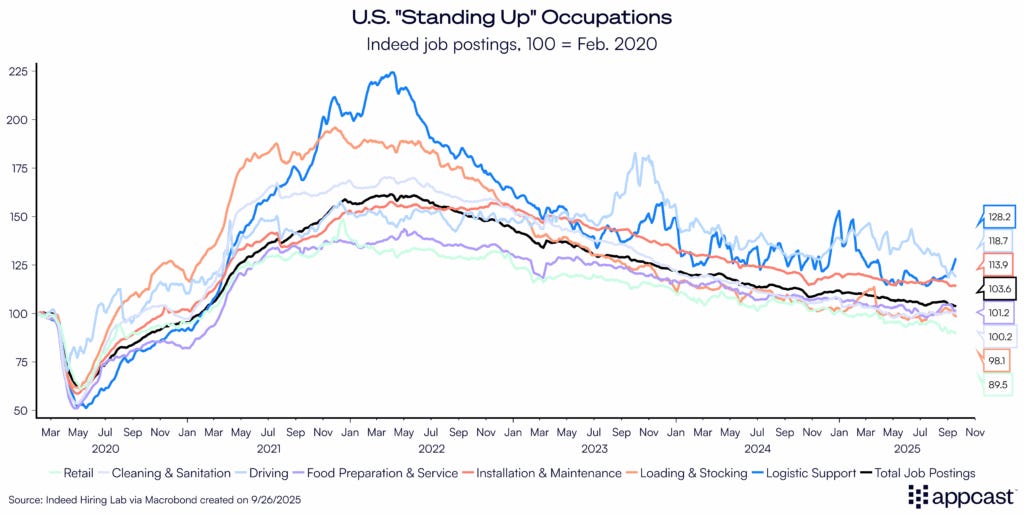 By contrast, many “sitting-down” categories (tech; professional & business services) face a slower hiring cadence as employers protect “unit economics” (aka profit protection), while AI-enabled productivity gains and higher capital costs curb incremental requisitions. Don’t bank on a rapid rebound here unless rates fall faster than the Fed currently signals.